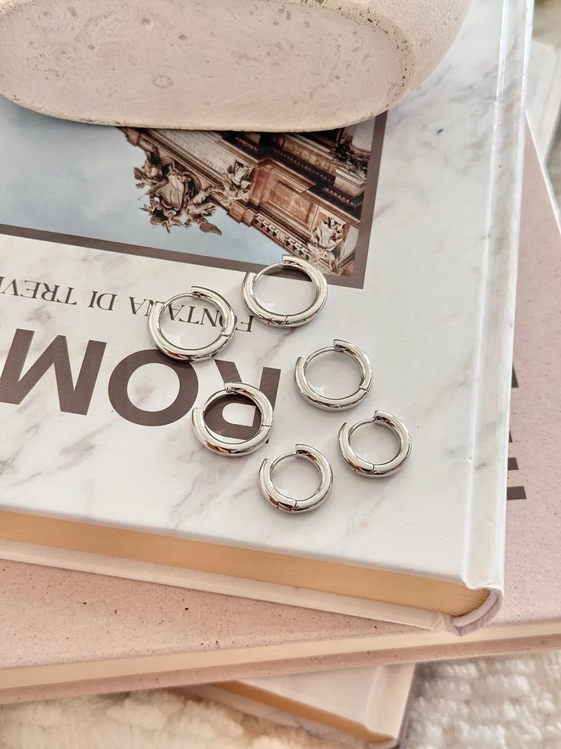 Hoops esenciales en acabado plateado, disponibles en tres tamaños: pequeño, mediano y grande. Su diseño clásico y versátil los hace ideales para cualquier ocasión, agregando un toque de estilo atemporal a tus outfits. 💫✨